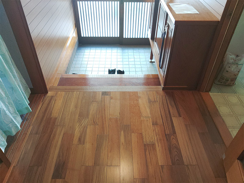 フローリング:イクタ 銘木フロアーシルク12mm厚(色柄:チーク、品番:AW-JT033S) 框:イクタ フローリング対応品 |